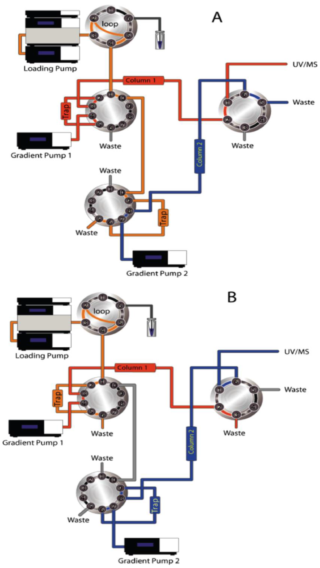 Plumbing scheme showing the (dual) nano HPLC separation system with (A) trap column and nano column 1 operated in eluting loading position while trap column and nano column 2 are equilibrated and prepared for the following sample injection; and (B) trap column 1 and nano column 1 are being equilibrated while the analytes are being eluted from trap column 2 and nano column 2. The trap column was operated in a back-flush mode ensuring minimal peak broadening and preventing peptide separation before the transfer on the nano separation column.