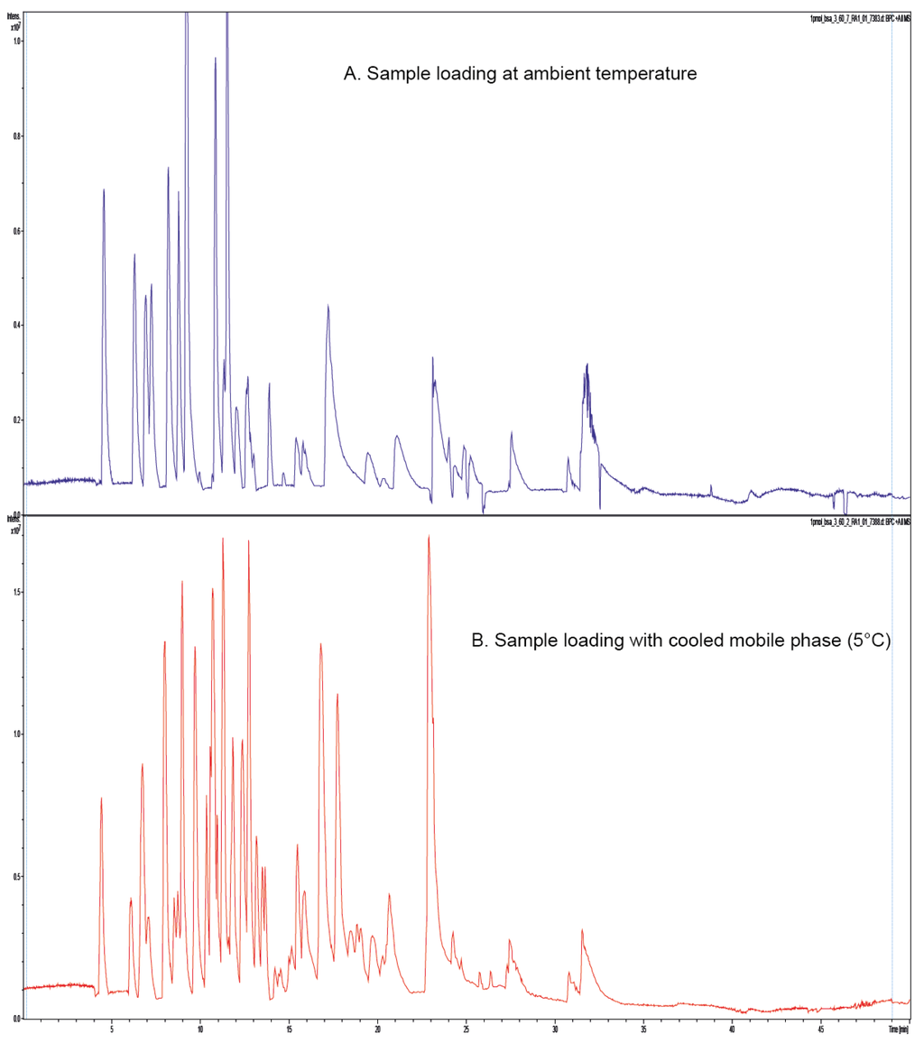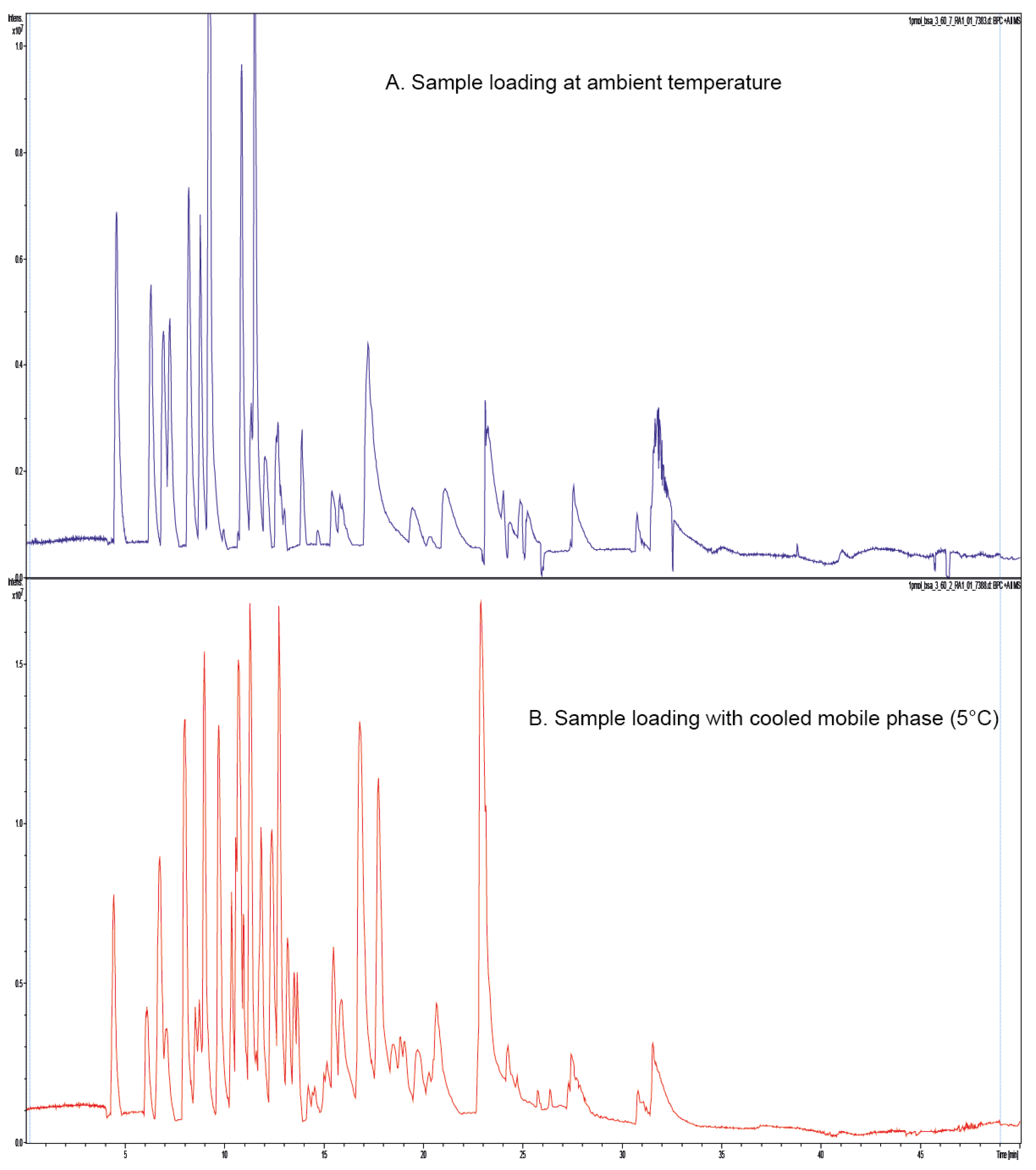We were able to show that a normal laboratory cooling bath set to 5 °C can be safely used for routinely cooling the loading mobile phase.