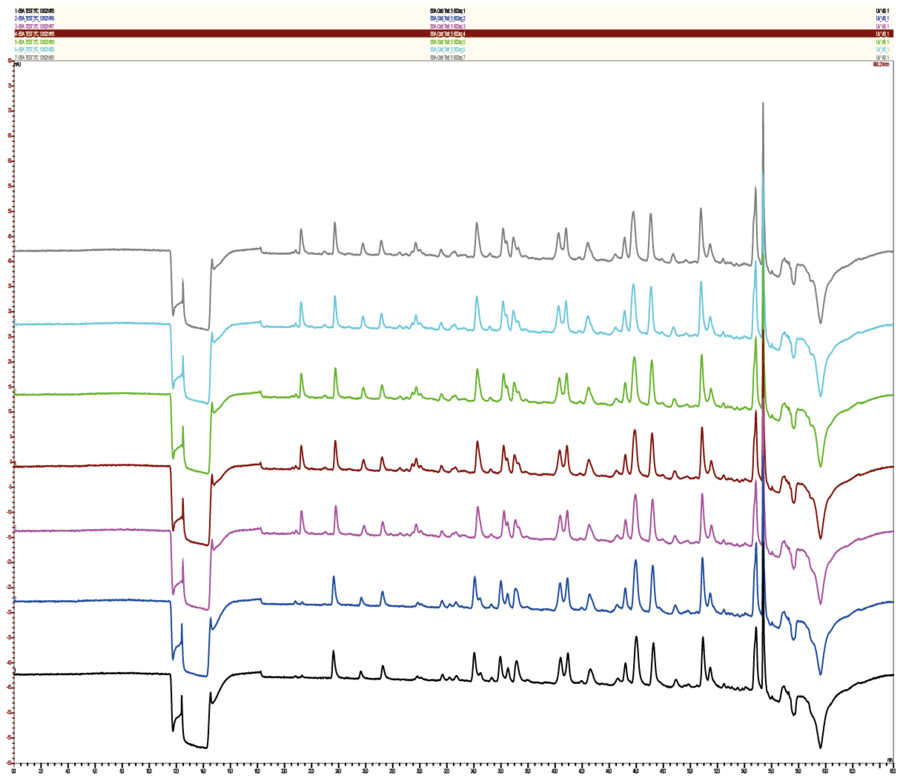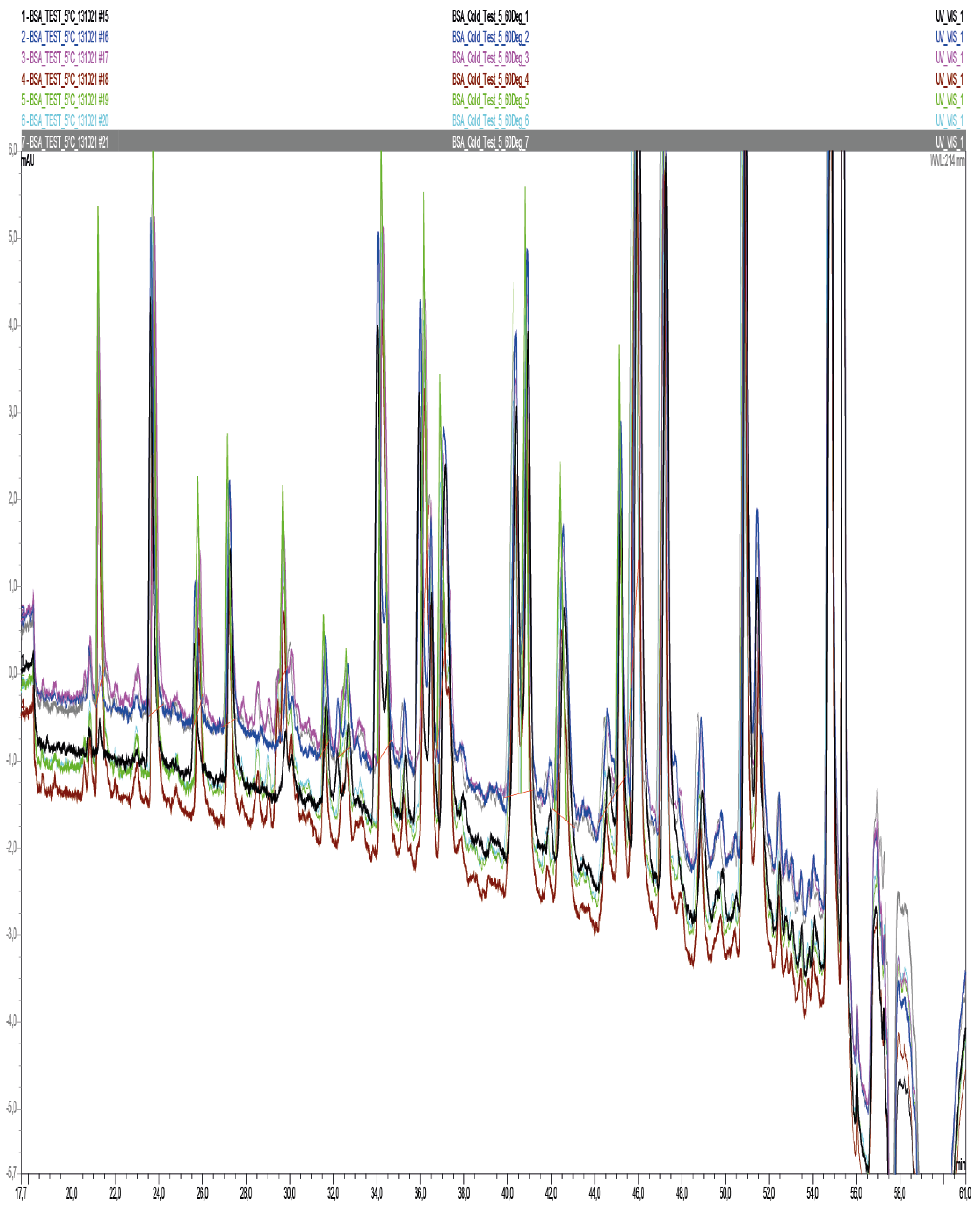 Zoom in of seven consecutive, overlapped, chromatograms showing separation of BSA tryptic peptides. The retention time’s reproducibility ranged from 0.05% for the first peak eluted at 21.2 min and 0.48% for the peak eluted at 55.3 min.