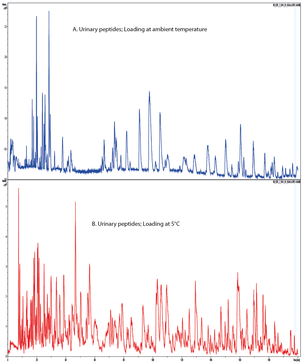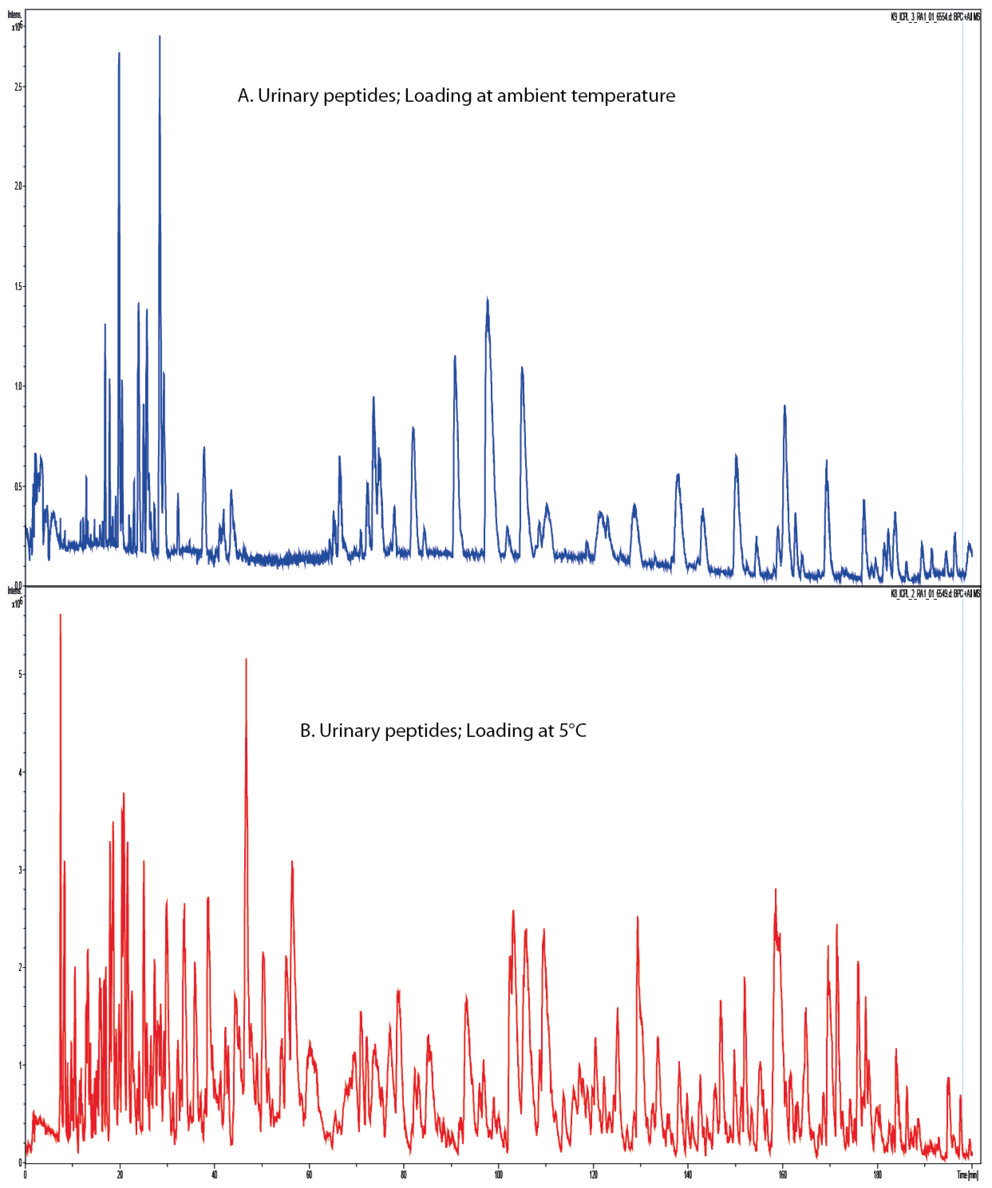 MS-Base Peak Chromatogram showing separation of tryptic peptides obtained from urinary proteins. (A) Trap column and the nano separation column were operated at 60 °C loading mobile phase was not precooled; and (B) tryptic peptides from urinary proteins were separated using identical gradient as in (A) but with precooled loading mobile phase.