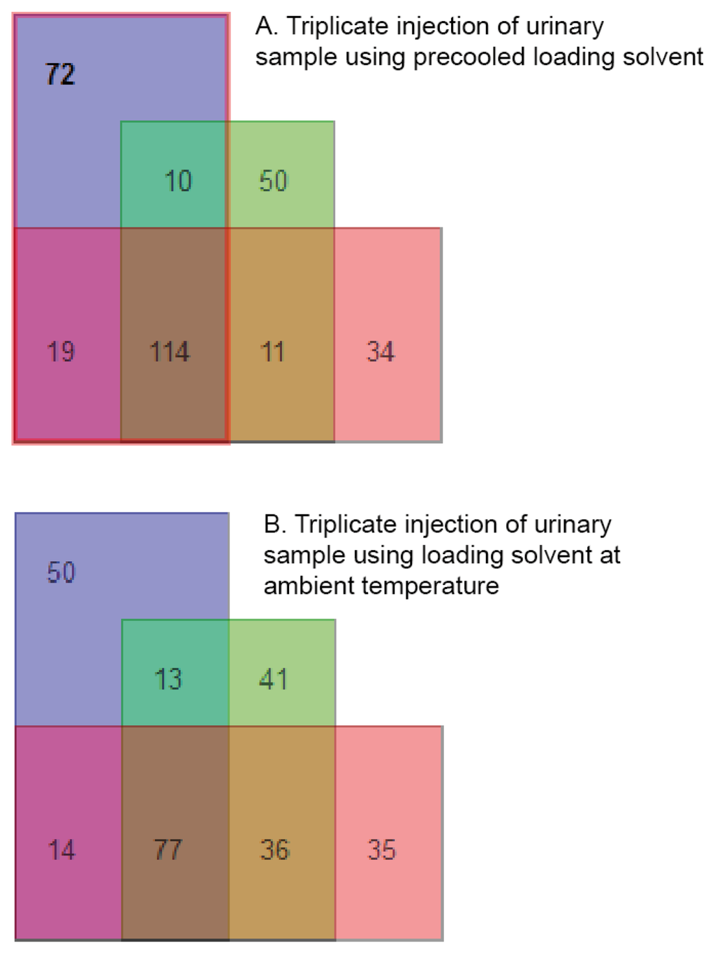 Reproducibility of protein identifications based on triplicate injections of tryptic urinary peptides using precooled (A) loading mobile phase and (B) mobile phase at ambient temperature.