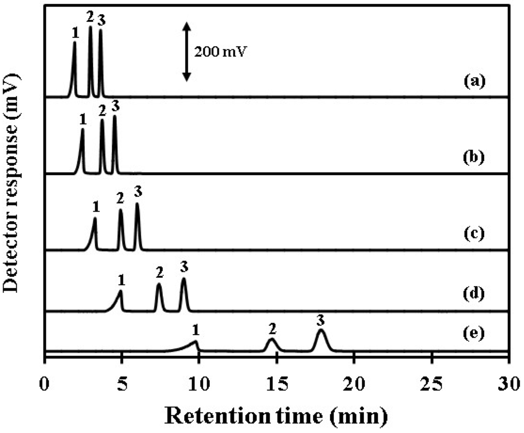Chromatograms of four weak inorganic acids with eluent flow rate at (a) 1.0 mL·min−1; (b) 0.8 mL·min−1; (c) 0.6 mL·min−1; (d) 0.4 mL·min−1 and (e) 0.2 mL·min−1. Conditions: separation column, polymethacrylate-based weakly acidic cation-exchange resin column TSKgel Super IC-A/C (150 mm length × 6.0 mm i.d.); eluent, ultra pure water; injected sample, a mixture solution of 10 mgP·L−1, 10 mgSi·L−1, 100 mgB·L−1 and 21 mgC·L−1; injected volume, 100 μL; column temperature, 45 °C. Peaks identification: 1, phosphoric acid; 2, silicic acid; 3, boric acid.