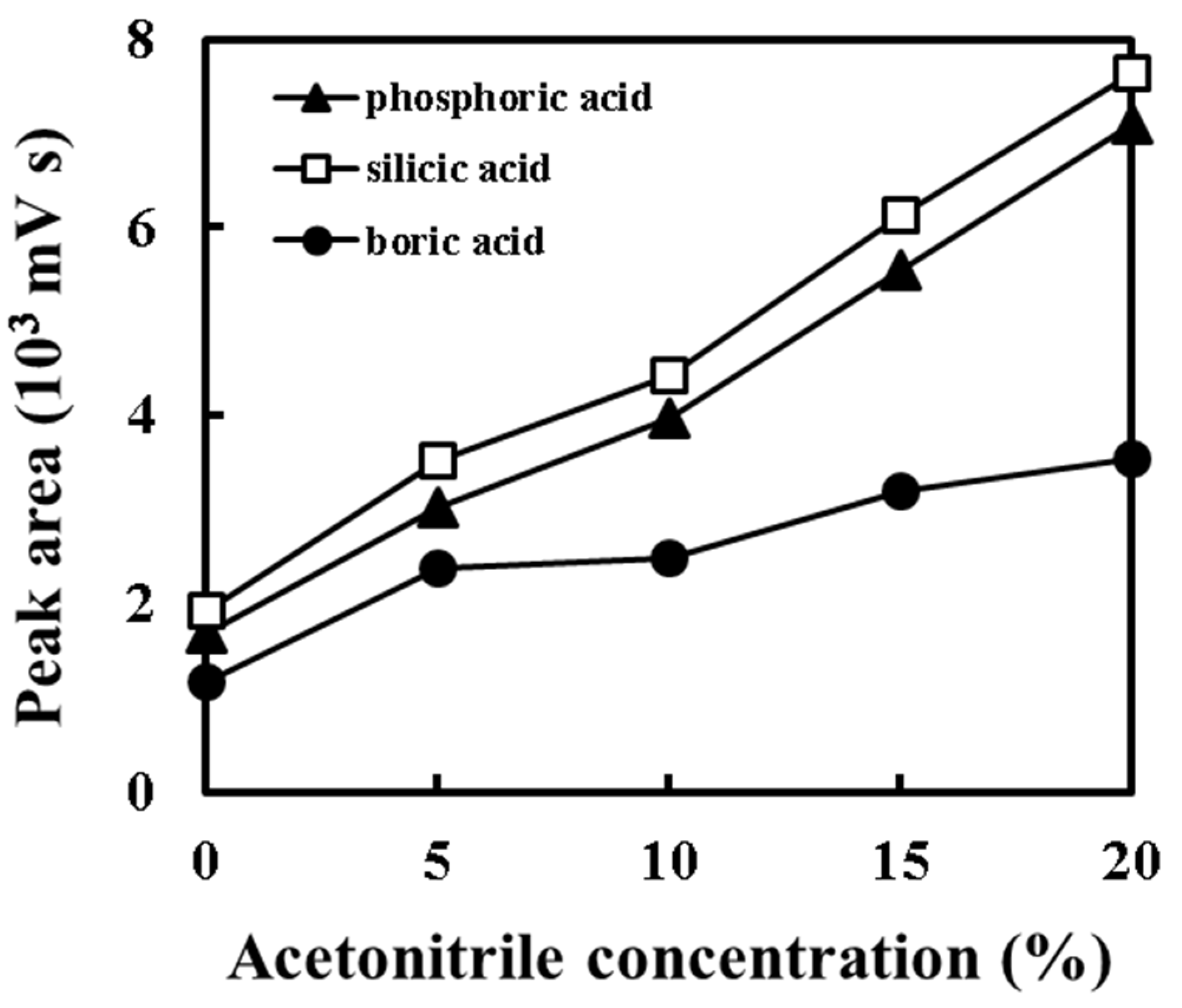 Effect of acetonitrile concentration in the eluent on the detector responses for phosphoric, silicic and boric acids. Conditions: flow rate of eluent, 0.6 mL·min−1.Other conditions are the same as in Figure 1.