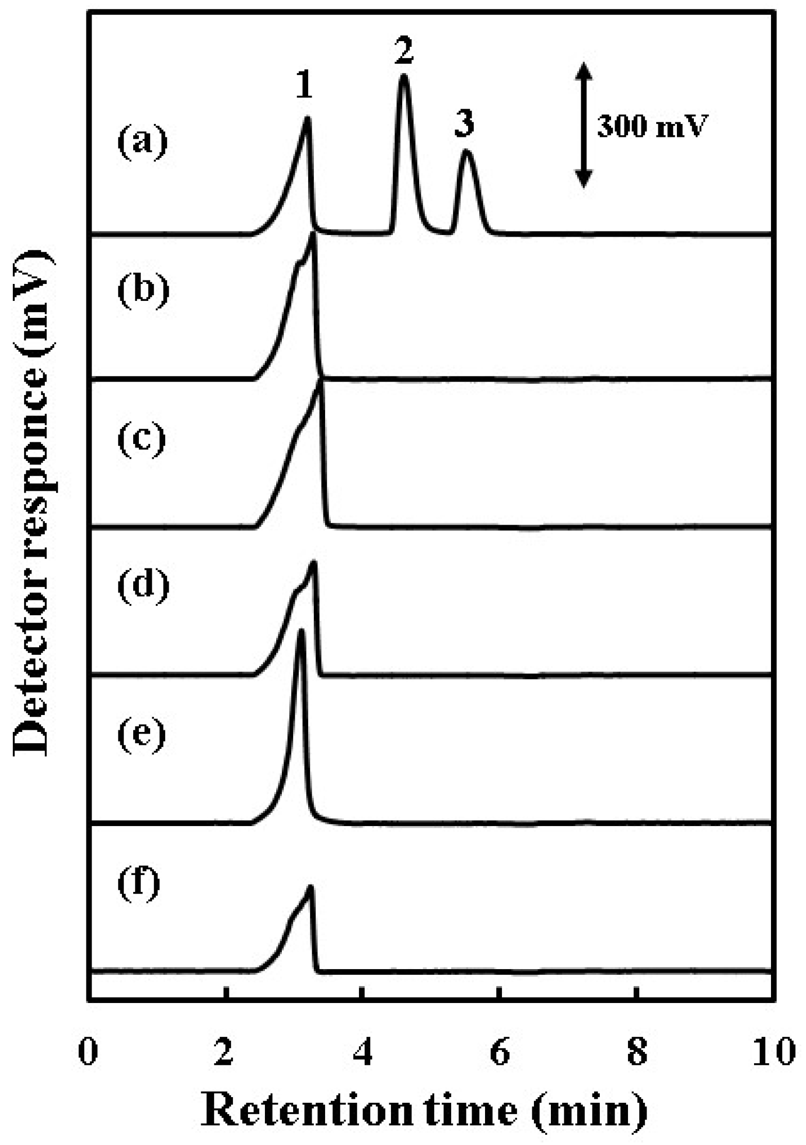 Typical chromatograms of (a) a mixture standard solution of phosphoric, silicic, boric and carbonic acids, and the solution of (b) 1 mmol·L−1 NaBr, (c) 1 mmol·L−1 KI, (d) 1 mmol·L−1 KNO3, (e) 0.5 mmol·L−1 Na2SO4 and (f) 1 mmol·L−1 NaCl under the optimized analytical conditions. Other chromatographic conditions are the same as for Figure 2. Peak identification: 1 strong acid anions (Br−, I−, NO3−, SO42− and Cl−) and phosphoric acid; 2, silicic acid; 3, boric acid.