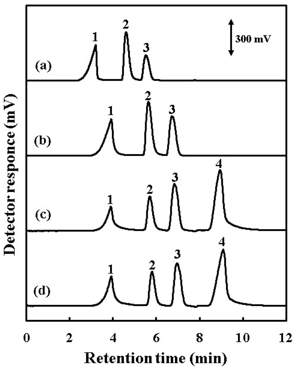Chromatograms of (a) a mixture standard solution of phosphoric, silicic, boric and carbonic acids without conversion column, and the solution with conversion column in (b) H+-form; (c) Na+-form and (d) K+-form. Condition: injected sample, a mixture solution of 10 mgP·L−1, 10 mgSi·L−1, 100 mgB·L−1 and 21 mgC·L−1. Other chromatographic conditions are the same as for Figure 2. Peaks identification: 1, phosphoric acid; 2, silicic acid; 3, boric acid; 4, carbonic acid.