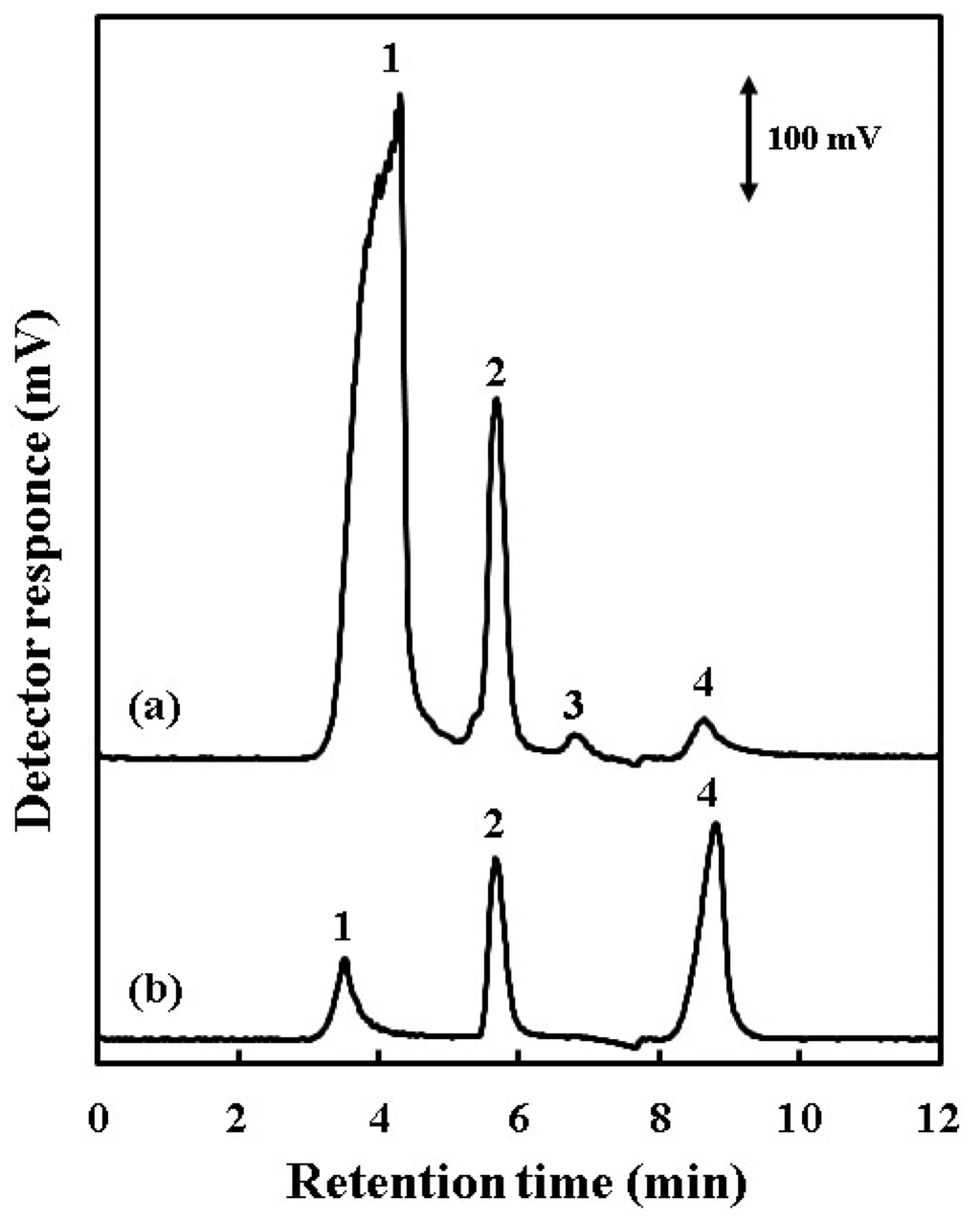 Typical chromatograms of (a) hot spring water (5-times diluted) and (b) drinking water (10-times diluted). Chromatographic conditions are the same as for Figure 2. Peaks identification: 1, phosphoric acid and strong acid anions; 2, silicic acid; 3, boric acid; 4, carbonic acid.