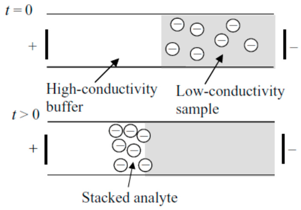 Field-amplified sample stacking/sample injection has long been considered. It is one of the most commonly used, straightforward modes of electrophoretic separation. The stacking effect can be achieved through a conductivity difference between samples and background electrolyte (usually the conductivity of background electrolyte is 10 times higher than that of the sample). When the voltage is applied, the electric field strength on the sample is higher compared to the background electrolyte, due to the lower conductivity. As a result, sample starts to stack in the boundary—the nominal location of the gradient (Figure 1).