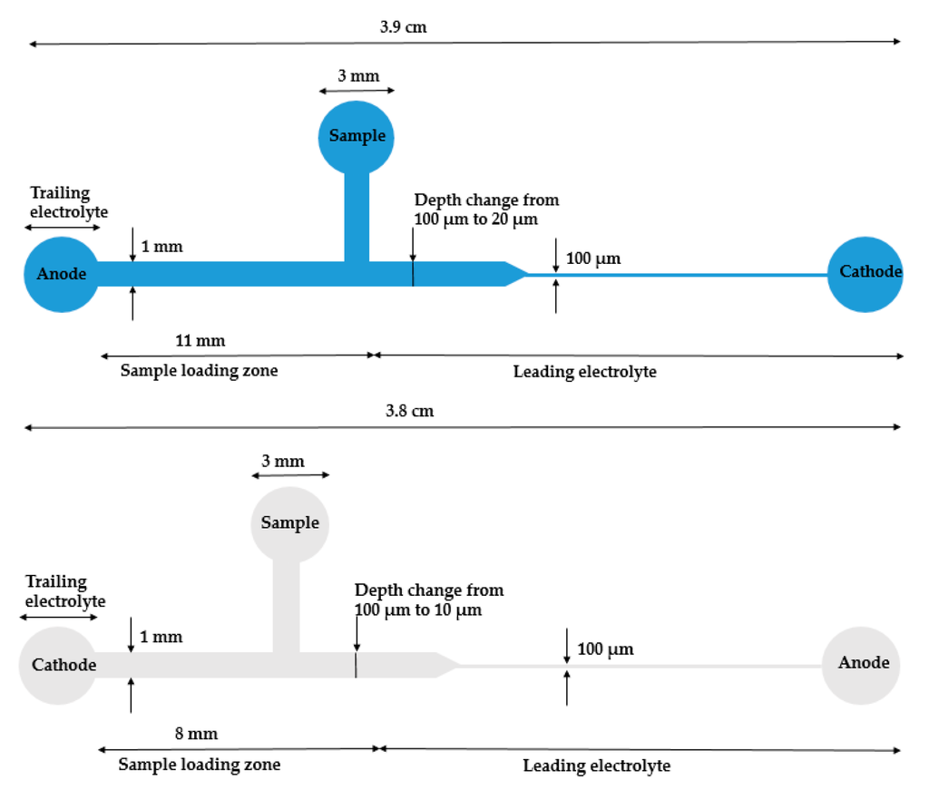 Santiago’s group led the development of bidirectional ITP as well. In their work, they achieved bidirectional ITP in a straight channel through the application of shock wave [60,61]. Different from monodirectional ITP, in their applications, four electrolytes were used, namely cationic leading electrolyte, cationic terminating electrolyte, anionic leading electrolyte and anionic terminating electrolyte. Using anionic analytes as an example, when voltage was applied, they formed distinct bands between leading electrolyte and terminating electrolyte, migrating in one direction. At the same time, the cationic electrolytes also underwent isotachophoresis, migrating in the opposite direction. When these two shock waves met, there would be a replacement of ions, so the conditions would dramatically change. In one of these applications, the ion-exchanging process eliminated the isotachophoresis condition. Then, it was switched to electrophoretic separation automatically without any treatment, and the non-focusing tracer method was used to visualize experimental results [60]. In another case, they successfully generated the LE concentration cascade to further increase the sensitivity of the ITP technique [61]. Their schemes could also achieve bidirectional ITP for protein and DNA purifications [62]. This bidirectional device was with one single input in the middle and two output reservoirs connected by two “C”-shaped channels for ITP separation of proteins and nucleic acids simultaneously. One channel conducted cationic ITP for enriching positively charged proteins; the other channel performed anionic ITP for negatively charged nucleic acids from human blood serum. This bidirectional ITP method was demonstrated to have high recovery efficiency and compatibility with PCR and other extraction methods.