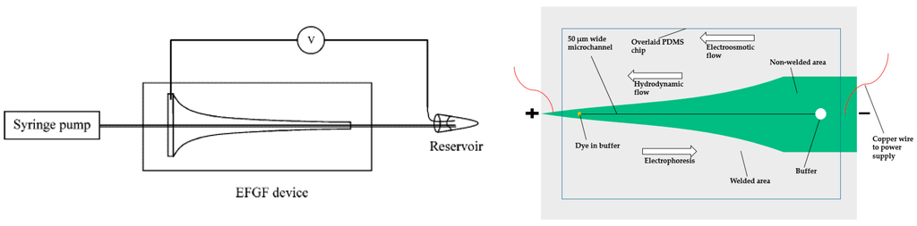 An alternative technique, temperature gradient focusing (TGF), was described by Ross’s group (Figure 7, left) [95,96,97]. In this technique, the electric field gradient was created with a buffer with a temperature-dependent ionic strength and local heating. Pressure-driven flow was balanced by the varying electrophoretic velocity, and the targeted analytes can be focused at a specific position.