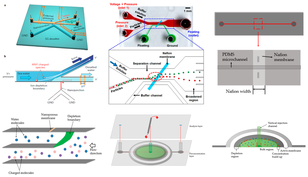 A novel nanostructure with the Nafion membrane for separation of salted species from seawater was shown by Han and his coworkers (Figure 9, top left) [112]. In their device, the nanostructure was located at the intersection of two branches. Due to ion depletion, the charged species were repelled to one branch, while the desalted species (mainly water) could flow through the other. Since the charged species were repelled, the nanoporous membrane did not foul. They showed that 99% of the salt could be removed and that the energy consumption was low. However, recent work demonstrated that it was not as efficient as initially presented. Nevertheless, this was a very successful trial and provided a convenient way to address the global water-shortage problem. Later, the same device was used for separation of biomolecules and cells [113].