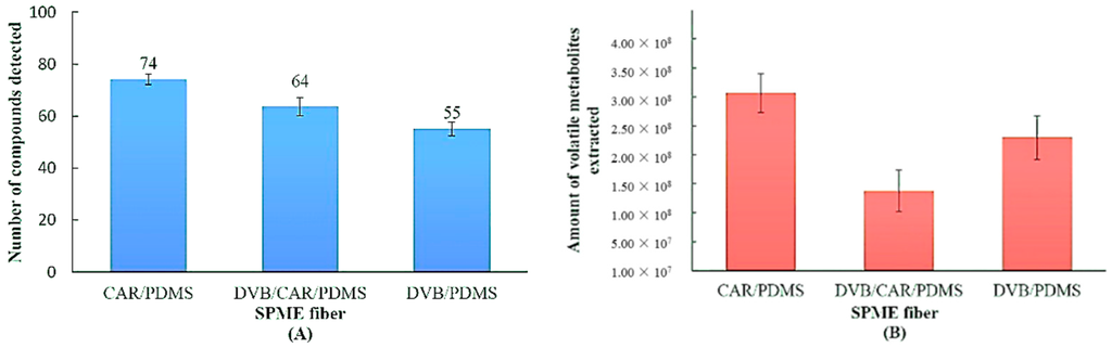 Solid phase microextraction (SPME) fibers’ comparison through the number of (A) and amount of (B) volatile metabolites extracted from A. flavus culture using three types of SPME fibers, carboxen (CAR)/PDMS, divinylbenzene (DVB)/CAR/PDMS and DVB/PDMS, in six replications. The error bars indicate the standard deviation of six replicates.
