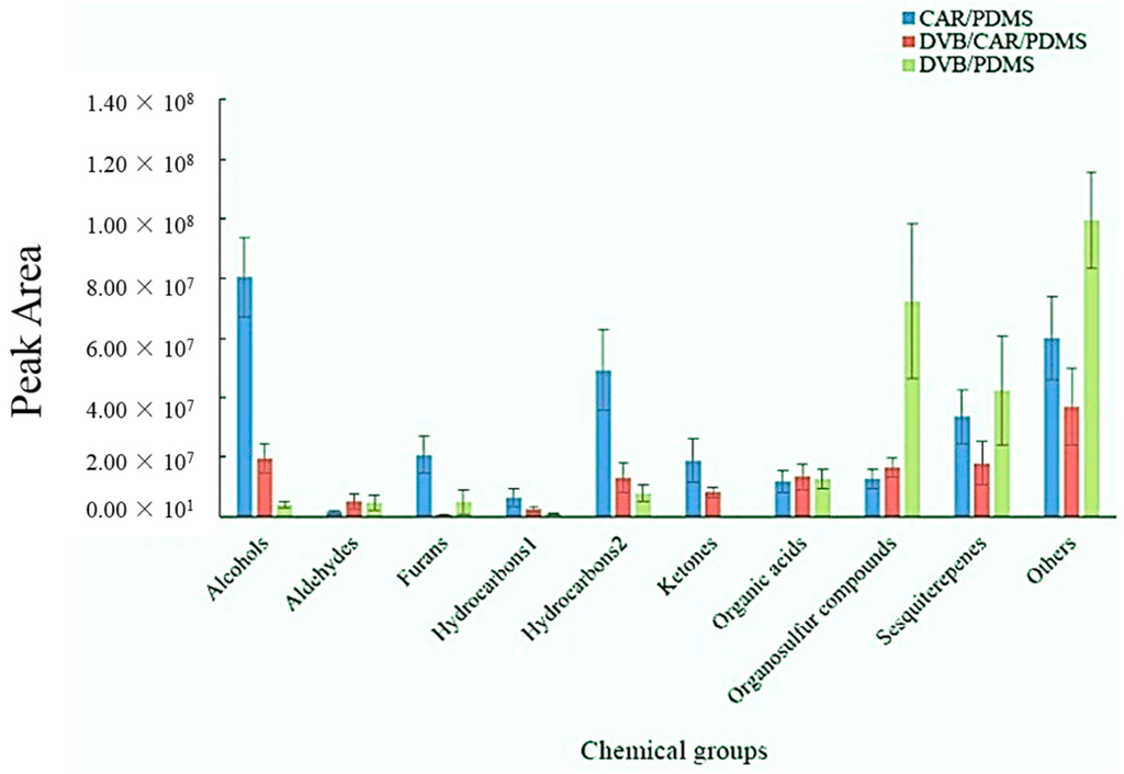 The CAR/PDMS fiber extracted greater amounts of alcohols, furans, Hydrocarbon 1, Hydrocarbon 2 and ketones, while DVB/PDMS extracted larger amounts of high molecular weight compounds containing the organosulfur compounds, sesquiterpenes and other compounds (Figure 2). These results agree with the literature, which describes the CAR/PDMS as likely to extract low molecular weight compounds, while DVB/PDMS is better at extracting high molecular weight compounds [56].