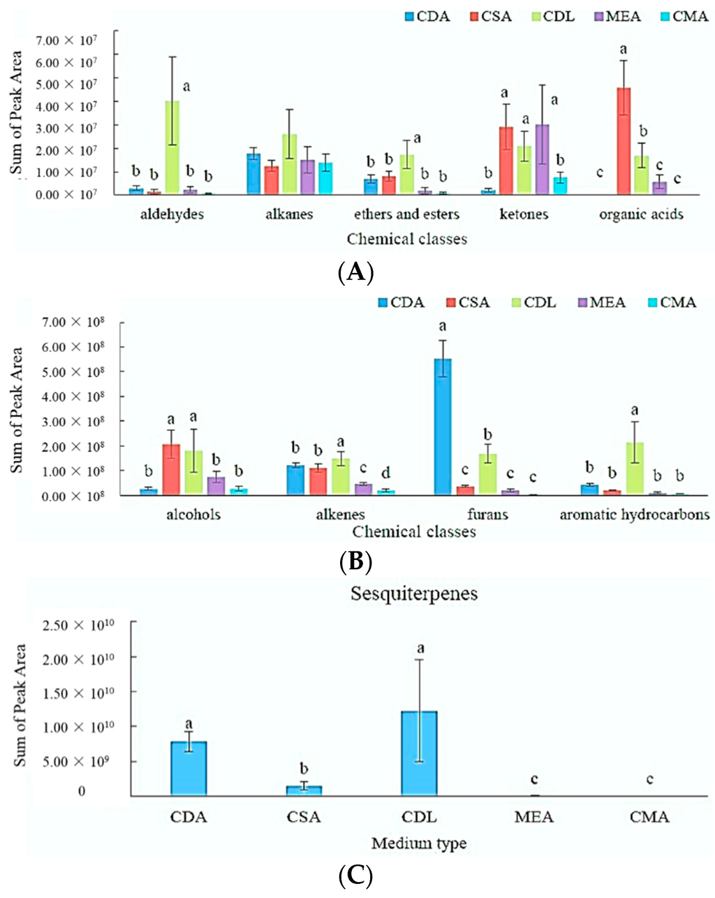Comparison of the amount of volatile metabolites (sum of peak area with SD (six replicates)) emitted by A. flavus 5-3B on growth media CDA, CSA, CDL, MEA and CMA. Different letters above the bars indicate significant differences (MANOVA, p < 0.05). The data with the highest total ion current (TIC) for each chemical class starts with label a. The TIC of each medium shows no significant difference in the alkane group. (A): Chemical classes of aldehydes, alkanes, ethers and esters, ketones and organic acids; (B): Chemical classes of alcohols, alkenes, furans, aromatic hydrocarbons; (C): Medium type.