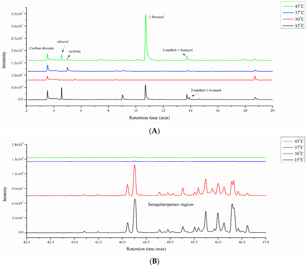 TIC chromatogram comparison of MVOCs’ profiles obtained from A. flavus 5-3B grown at different temperatures (15, 30, 37 and 45 °C). (A): Retention time from 2 to 20 min; (B): Retention time on sesquiterpenes region.
