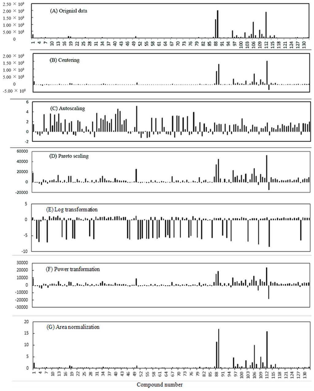 Another objective of data pre-treatment is converting a non-normal distribution of the specific variable into a normal one. One way to accomplish this is through log transformation (Figure 5E). The benefits of this sort of transformation include: (1) simplifying the response function by linearizing a non-linear response-factor relationship; (2) stabilizing the variance of the residuals; and (3) making the distribution of the residuals more normal, which can serve to eliminate outliers. Power transformation plots the square root of the data (Figure 5F) and is similar to the Pareto scaling method. Finally, the area normalization method (Figure 5G) showed similar results when compared to the original data (Figure 5A). The area normalization method is a semi-quantitative approach using the relative percentage of each compound of the total MVOCs extracted.