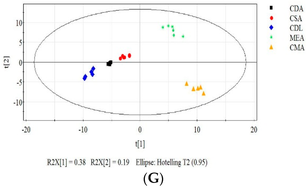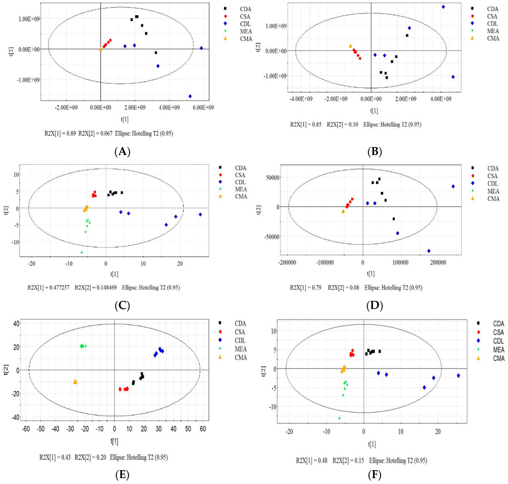 In the original (Figure 6A) and centering data (Figure 6B), MEA, CMA and CSA clusters “squeeze” together because CDA and CDL have much larger variances in the data caused by a higher concentration of MVOCs. Large variances play an important role for the classification of different categories (media) in PCA analysis. Poor cluster separation resulted from data pretreatment without a “hard” scaling method, such as autoscaling. Pareto scaling is the intermediate between no scaling and autoscaling, which also showed unfavorable classification.