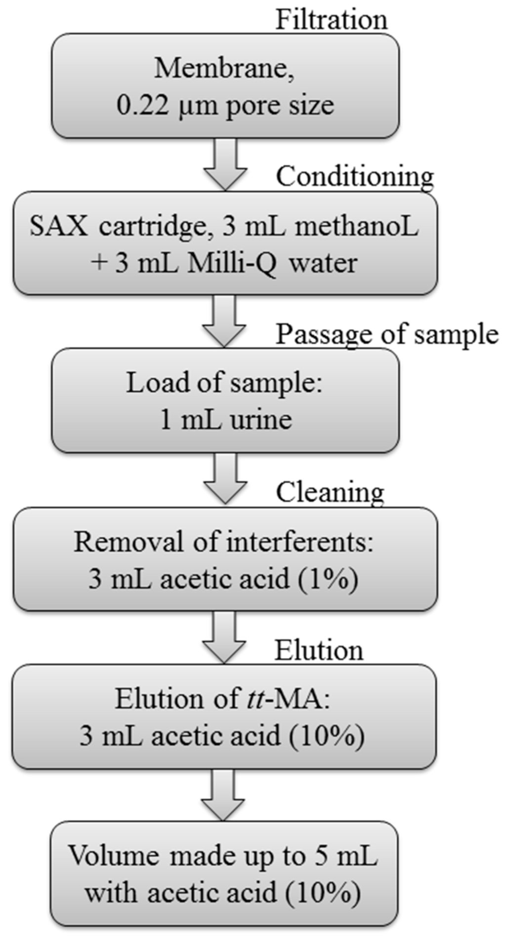 The sample was filtered through a 0.22 μm membrane, after which the tt-MA was extracted using a SAX cartridge. The extraction was performed under vacuum using a manifold with a capacity for 12 cartridges. The entire procedure was performed in triplicate.