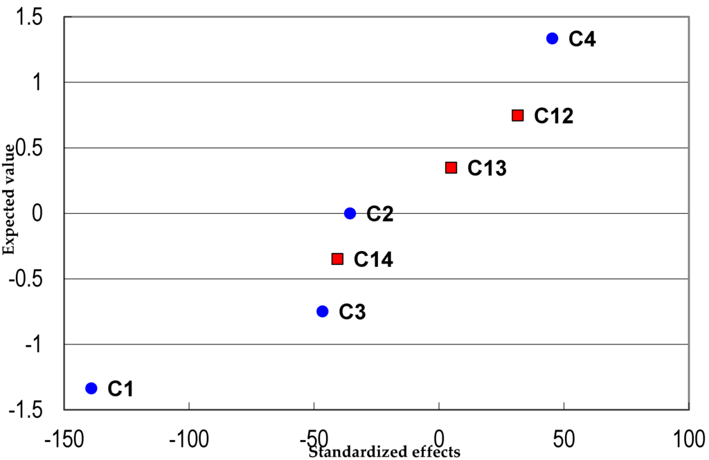 Normal probability plot showing the effects of sample buffering (C1), removal of interferents (C2), final volume (C3) and sample volume (C4).