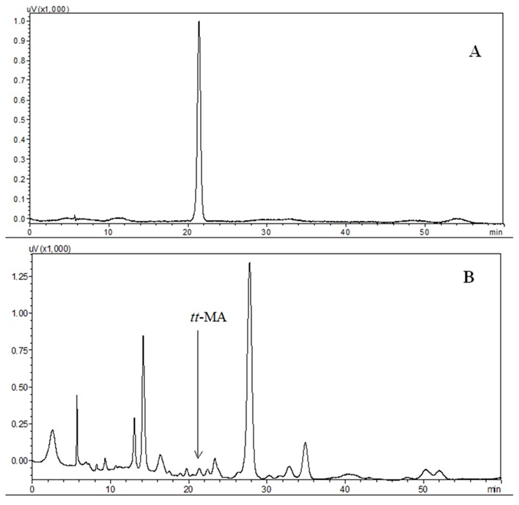 Chromatograms obtained for the separation of tt-MA using the Aminex HPX-87H (300 mm × 7.8 mm) ion exchange column with a mobile phase of 0.01 mol·L−1 sulfuric acid at a flow rate of 0.6 mL·min−1, detection by diode array detector (DAD) at 264 nm. Chromatogram A: standard solution of tt-MA (500 µg·L−1); Chromatogram B: in natura urine sample.
