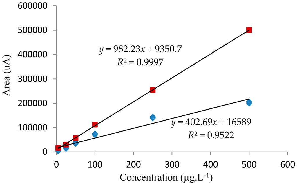 Interferences caused by the presence of the biological matrix were assessed by comparing the coefficients of determination obtained for analytical curves constructed using aqueous standard solutions and standard solutions prepared using the pooled urine sample. The SPE extraction was performed under the optimized conditions.