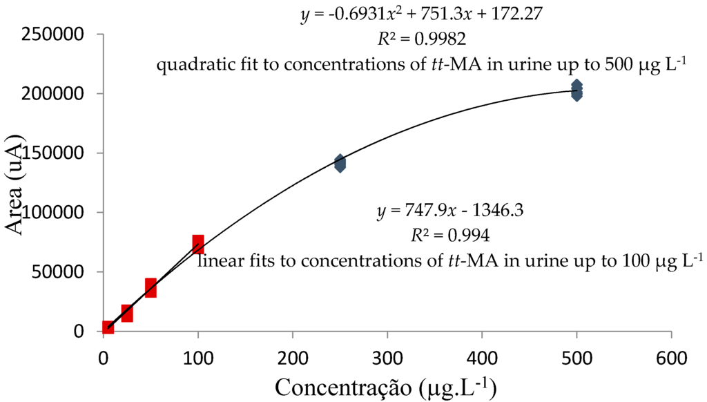 The concentrations used to determine the working range were based on tt-MA concentrations reported in the literature [42,50]. The results showed that linear fits (determination coefficient, R2 = 0.9909) could be applied to analytical curves prepared using concentrations of tt-MA in urine up to 100 µg·L−1. At higher concentrations (up to 500 µg·L−1), a quadratic fit (determination coefficient, R2 = 0.9982) could be used, or the samples could be diluted after the extraction step, in order to use the linear model.