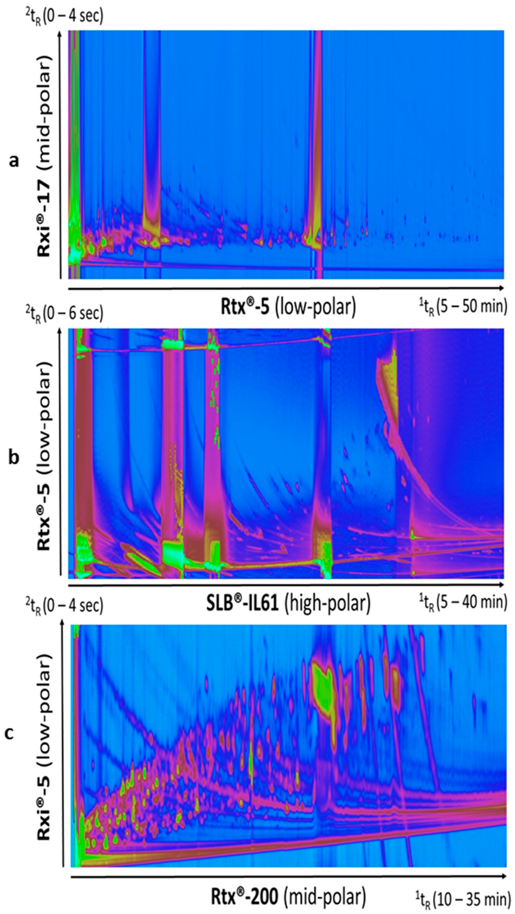 Two-dimensional gas chromatography-time-of-flight mass spectrometry (GC×GC-TOFMS) chromatograms obtained from analyses of a rough metabolite extraction of the gut of the termite Reticulitermes santonensis. Column sets 1, 2, and 3 were used for Figure 1a‒c, respectively. Samples were derivatized with the N-Methyl-N-(trimethylsilyl)trifluoroacetamide (MSTFA) silylation reagent. Column set 3 (1D mi-polarity fluoropropyl × 2D low polarity 5% phenyl) provided the best occupation of the two-dimensional capacity and the best chromatographic fingerprint for data processing and comparison study. (a): Rtx®-5 (low-polar); (b): SLB®-IL61 (high-polar); (c): Rtx®-200 (mid-polar).