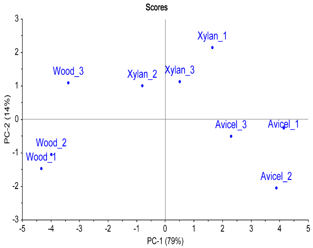 Samples of termites fed with wood, microcrystalline cellulose (Avicel) or xylan were analyzed and compared. Samples of five termite guts were collected in triplicate for each diet. Comparison of the multiple chromatograms was carried out towards the creation of a composite image and resulted in the highlight of 314 compounds compared in all the samples. These compounds were mainly amino acids, amines, sugars, sugar derivatives, and organic acids. It included metabolites involved in major pathways like tricarboxylic acid (TCA) cycle, purine metabolism and fermentation. Table 1 lists detected metabolites and compounds, based on their chemical structures. Retention times, peak volume and percent response data are available in supplementary information (Tables S1–S3). Only the compounds with a library match score identification >700 (or identified with standards), and not found in blank procedures were reported in the table. The principal component analysis (PCA) demonstrated a trend towards the separation of the samples related to the carbon source used by the termites (Figure 3). The first principal component (PC-1, 79%) covered a great part of the variation, separating the three different diets. The second principal component (PC-2, 14%) demonstrated a trend to separate the xylan diet from the wood and Avicel diets. This secondary separation could possibly reflect the influence of cellulose as a carbon source in the diet, as Avicel is a pure cellulose powder and cellulose is the main constituent of the wood (45%). The multivariate analysis demonstrated that the metabolite profile in the termite was dependent of the diet.