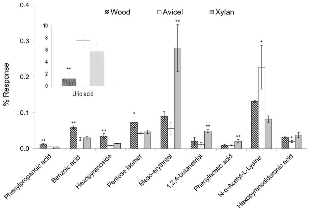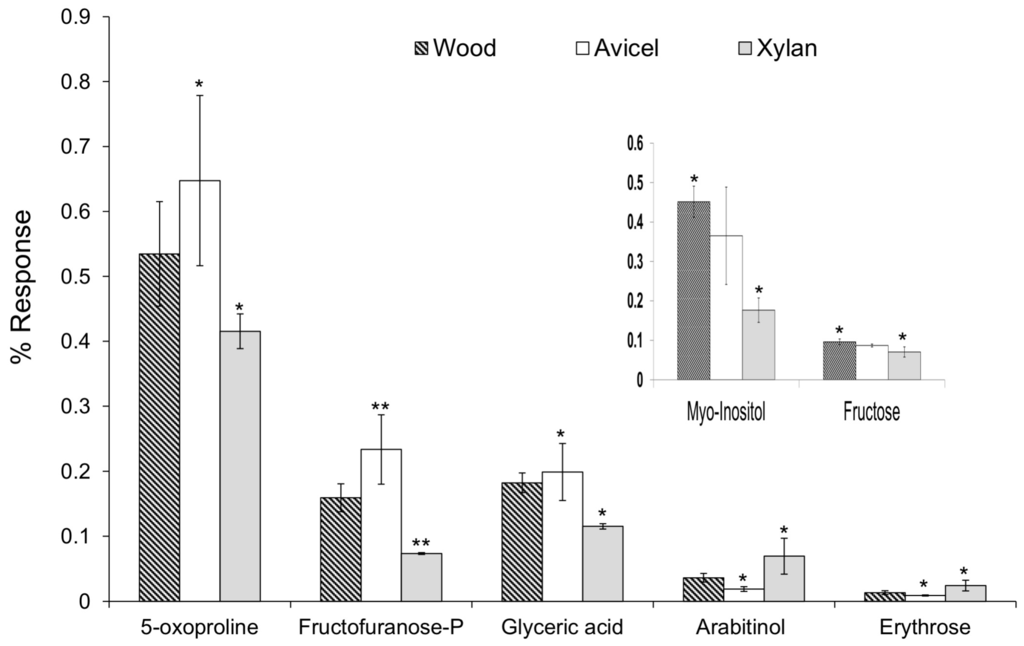 From pair-wise comparisons, several compounds with a significant F-value were different between only the Avicel and the xylan diets. These results were used to evaluate the influence of pentoses compared to hexoses as a carbon source. No significant differences were observed when compared to the wood diet, which included both pentoses and hexoses from cellulose and hemicellulose content. Higher levels of glyceric acid (F value = 8.2), 5-oxoproline (F = 5.0), and fructofuranose-P (F = 17.4) were found with the Avicel diet, whereas higher levels of arabitinol (F = 7.2) and erythrose (F = 7.1) were found with the xylan diet (Figure 5). For each compound, the wood diet presented an intermediate level.