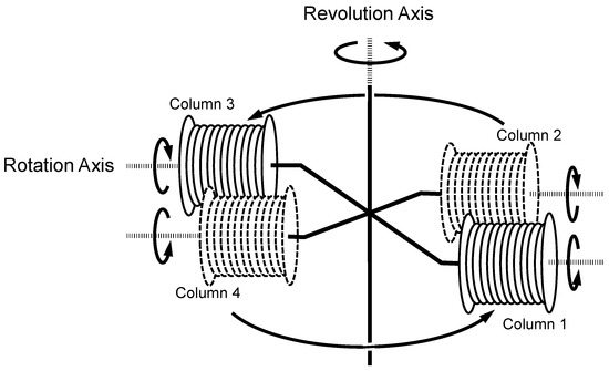 The small-scale cross-axis CCC employed in the present study was constructed at the Machining Technology Center of Nihon University (Chiba, Japan). The design and fabrication of the apparatus and the column configuration were previously described in detail [8,9]. Figure 1 illustrates the schematic drawing of the small-scale cross-axis CCC used in the present study. Four coiled columns are distributed at a constant distance from the central revolution axis. The neighboring columns rotate in the opposite direction to each other while revolving in a horizontal plane around the vertical axis of the centrifuge as indicated by a set of arrows.
