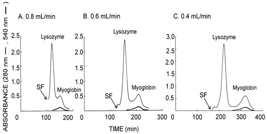 As shown in Figure 3, sufficient partitioning of proteins at the resolution of over 1.2 between aqueous two immiscible phases in the rotating column was achieved even at a relatively high flow rate of the lower mobile phase of 0.8 mL/min, while the separation was further increased by a lower flow rate but with a longer separation time. Figure 4 also suggested that more sufficient partitioning of proteins at the resolution of over 1.5 is accomplished at a lower flow rate of 0.4 mL/min with the upper mobile phase. As summarized in Table 1, the stationary phase retention is inversely proportional to flow rate. Decreased flow rate of the mobile phase produced the increase of stationary phase retention and peak resolution. In general, higher N value does not follow higher Rs values. Faster flow rate decreases separation time of each analyte due to the decrease of the stationary phase retention. As described in the conventional formula, apparently both retention time and W decrease at faster flow rates. If N increases or decreases depend on their rate of decrease, smaller W value calculates higher N value while all analytes elute within shorter separation time.