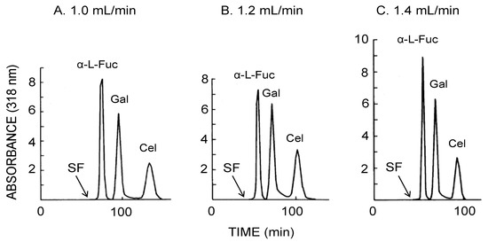 CCC separation of 4-methylumbelliferyl sugar derivatives obtained by the bead embedded locular multilayer coiled columns with the upper mobile phase at three different flow rates. Experimental conditions: apparatus: small-scale cross-axis CCC with four bead embedded locular multilayer coil assemblies, 1.5 mm I.D. and 90 mL total capacity; sample: 4-methylumbelliferyl derivative of α-l-fucopyranoside (1 mg), β-d-galactopyranoside (1 mg) and β-d-cellobioside (1 mg); solvent system: ethyl acetate/1-butanol/water (1:4:5, v/v); mobile phase: upper phase (inward elution); revolution: 1000 rpm; revolution direction: clockwise; fractions collected at 2 min/tube. SF = solvent front.