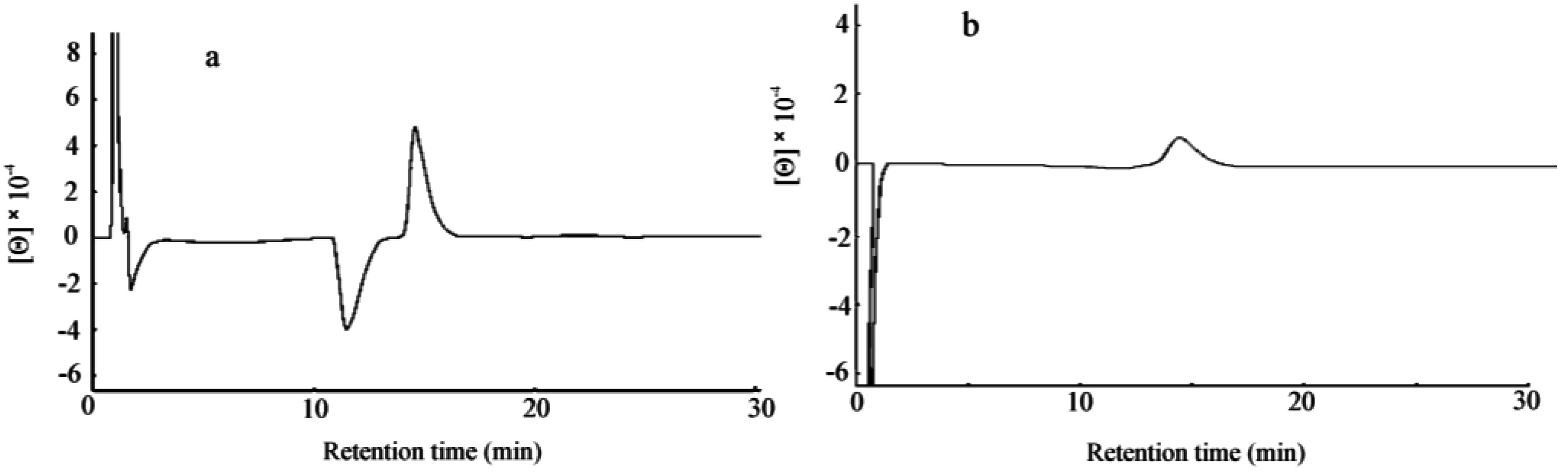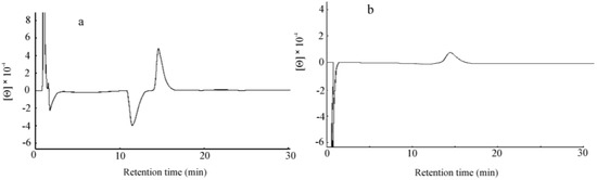 (a) Chromatogram of enantioseparation of d,l-tryptophan; (b) chromatogram of product of synthesis of tryptophan from d-serine catalyzed by tryptophanase in the presence of diammonium hydrogen phosphate, i.e., l-tryptophan. Crownpack CR (+) (chiral crown ether coated on silica gel) column, mobile phase (MP): aqueous solution of perchloric acid, pH 2.0; flow rate 1 mL/min, circular dichroism-1595 detector from Jasco [5]. Reproduced with permission from [5]. Copyright MDPI, 2009.