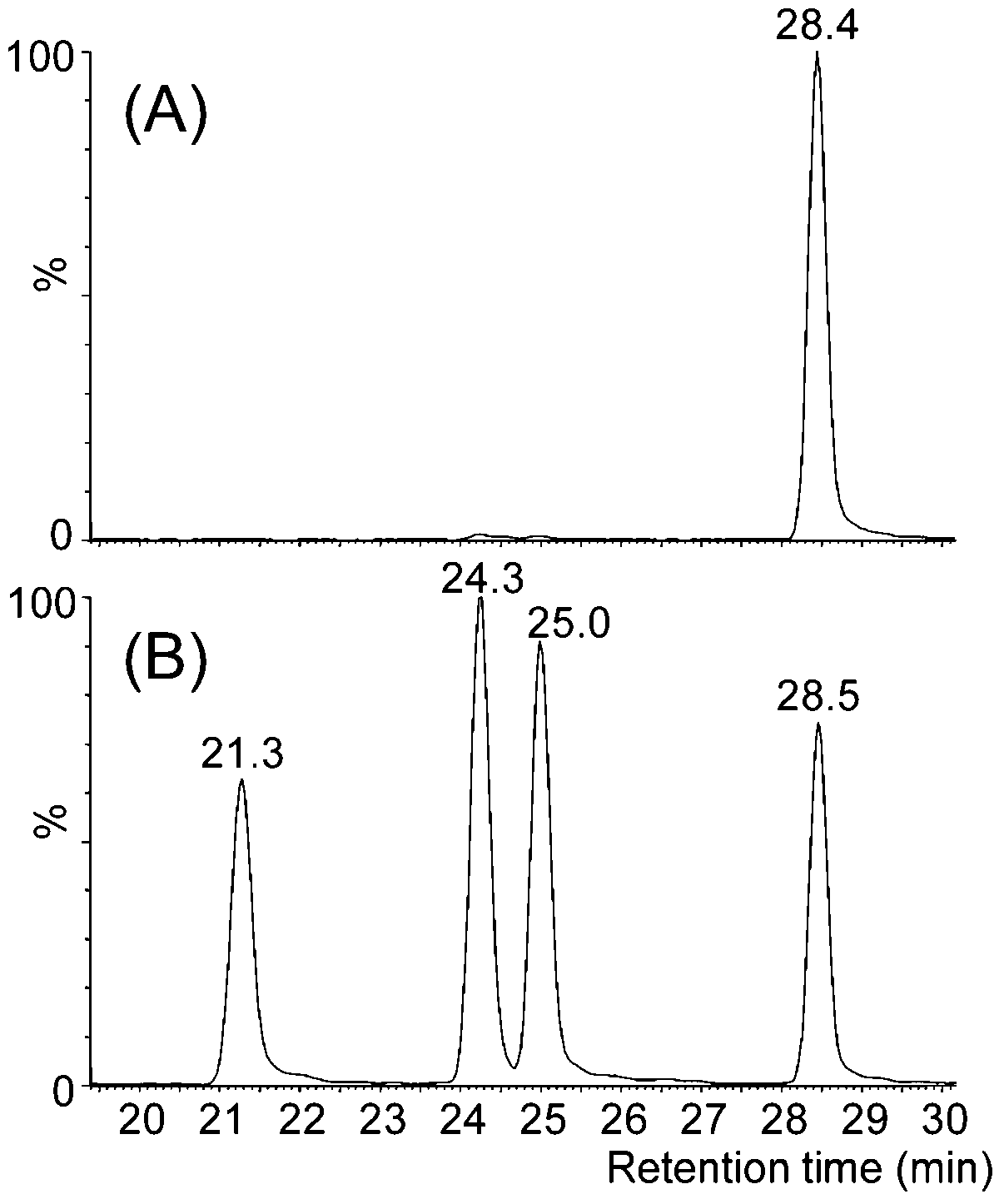 Selected reaction monitoring (SRM) chromatograms of N-Aβ1–5 standard solution. (A) SRM chromatogram (m/z 989.6 → m/z 637.0/678.9) for the isotope stable [15N]-labeled N-terminal peptide from Aβ1–40 (retention time (RT): 28.4 min); (B) SRM chromatogram (m/z 989.6 → m/z 637.0/678.9) for the N-Aβ1–5 with l-Asp (RT: 28.5 min), d-Asp (RT: 24.3 min), l-isoAsp (RT: 25.0 min), and d-isoAsp (RT: 21.3 min). This separation of the derivatized N-Aβ1–5 fragment included with l-Asp, d-Asp, l-isoAsp, and d-isoAsp was achieved using the UPLC BEH C18 column with a mobile phase consisting of 0.1% formic acid in water/methanol [84] Reproduced with permission from [84]. Copyright American Chemical Society, 2014.