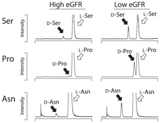 - Kimura, T.; Hamase, K.; Miyoshi, Y.; Yamamoto, R.; Yasuda, K.; Mita, M.; Rakugi, H.; Hayashi, T.; Isaka, Y. Chiral amino acid metabolomics for novel biomarker screening in the prognosis of chronic kidney disease. Sci. Rep. 2016, 6. [Google Scholar] [CrossRef] [PubMed]