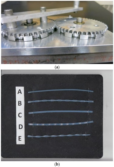 (a) Tubing modifier; (b) Standard and four differently modified tubings. A: standard; B: Intermittently pressing (IP) 10 mm; C: Flat; D: Flat-wave; E: Flat-twist.
