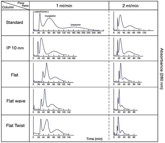 Figure 2 shows a set of chromatograms obtained from the separation of three test proteins with a two-phase solvent system composed of PEG 1000 and dibasic potassium phosphate, each at 12.5% (w/w) in deionized water. All separations were performed at flow rates of 1 and 2 mL/min under 800 rpm. Partition efficiency and retention of the stationary phase of these separations are all normalized to a 60 mL column capacity for fair comparison (Table 1). At 1 mL/min flow rate, all of the modified columns show higher partition efficiency over the standard column. Among the four modified columns, IP 10 (intermittently pressed at 10 mm width at 10 mm interval) and flat-twisted tubing show the best results. At 2 mL/min flow rate, however, the partition efficiencies of modified columns were all sharply decreased, associated with the lowered stationary phase retention, especially in flat-waved tubing, while the IP 10 column still maintained higher peak resolution (1.17/1.21) than the non-pressed standard column (1.09/1.15). It is interesting to observe that the standard column and IP 10 could maintain higher retention level of the stationary phase than three other flat pressed columns which restrict the flow of the mobile phase through narrow opening of the channel.