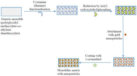 For instance; one of the very first works in the attachment of AuNPs onto the surface of poly(BuMA-co-EDMA) monolithic adsorbents was conducted by the group of Connolly et al. [114]. This was successfully achieved by means of hydrogen abstraction of azlactone monomers from the pore surface of poly(BuMA-co-EDMA). Thereafter, cysteamine and ethylenediamine were used in separate experiments to introduce pendant amino and thiol functional groups, respectively, into the monolith, followed by immobilisation of AuNPs. Despite the success of this protocol, steric hindrance during the immobilisation of AuNPs may occur leading to the reduction of its immobilisation density. This is due to the bifunctional nature of both cysteamine and ethylenediamine which could lead to the formation of crosslinks when they react with epoxy or azlactone functional groups of the monolith [20]. An improved approach is via reaction mechanisms that utilise tris(2-carboxylethyl)phosphine leading to the reduction in disulphide bonds [20,22].