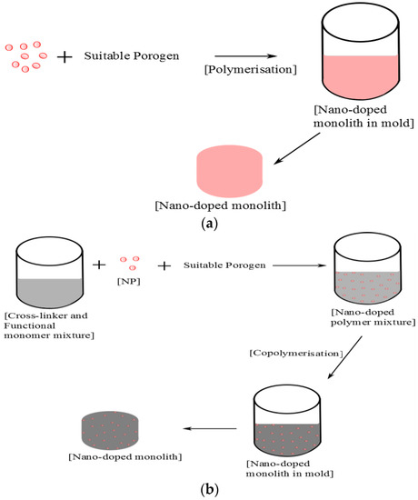 An example of an in situ approach to the synthesis of a porous monolithic unit. (a) Nano-doped monolith via polymerisation of nanoparticles; (b) Enhanced macroporous monoliths synthesised through copolymerisation of nanoparticles and monomers.
