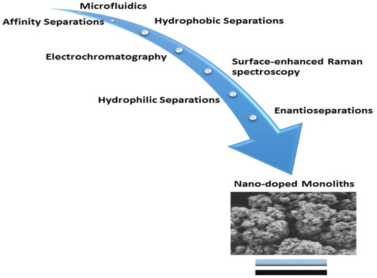 For polymeric monoliths, Lv et al. [20] reported that challenges with co-polymerisation of monoliths include (i) potential absence of desirable functional groups; (ii) inability to access/activate a large portion of concealed functional groups and (iii) the need to re-optimise polymerisation conditions for different monomer combinations to attain desirable porosity, surface morphology and chemistry. The incorporation of nanoparticles into monolithic matrices via post-modification processes has been demonstrated to be one of the suitable ways to easily overcome the aforementioned challenges [21,22]. Owing to the unique properties such as large surface area-to-volume ratio, biocompatibility, susceptible to chemical modification, and other inherent physical, thermal and chemical properties of some nanoparticles, they are able to undergo copolymerisation with suitable monomers to form monoliths [23,24]. As a result, monoliths, synthesised with nanoparticle doping through either in situ polymerisation or post-polymerisation surface modification, are embodied with features and properties of the nanoparticles to enhance their performance. Despite the vast availability of varied nanoparticles with different unique properties, limited study has been carried out to explore their potential in enhancing the performance of molecular separation media. This article therefore provides an overview of nano-doped polymer monoliths, challenges and prospects to advance molecular separation.