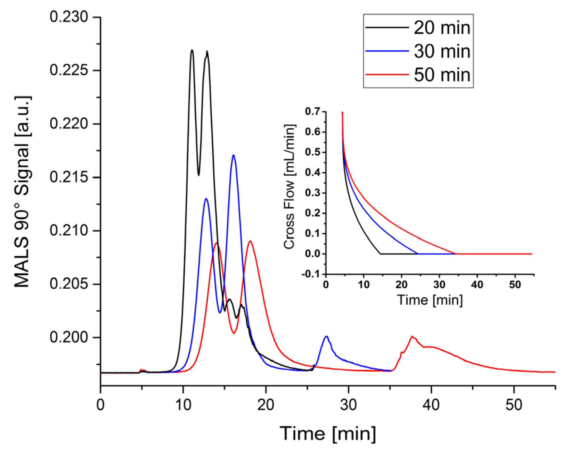 Since a constant (high) cross flow would result in long retention times mainly of larger particles, a decrease of the separation force during the elution has to be enabled. In our experiments, different cross flow rates and elution exponents were applied. Moreover, the injection time was varied. This parameter plays an important role. Particles need sufficient time to get equilibrated while focusing in the injection zone, whereas too long injection times are supposed to induce aggregation or at least agglomeration.