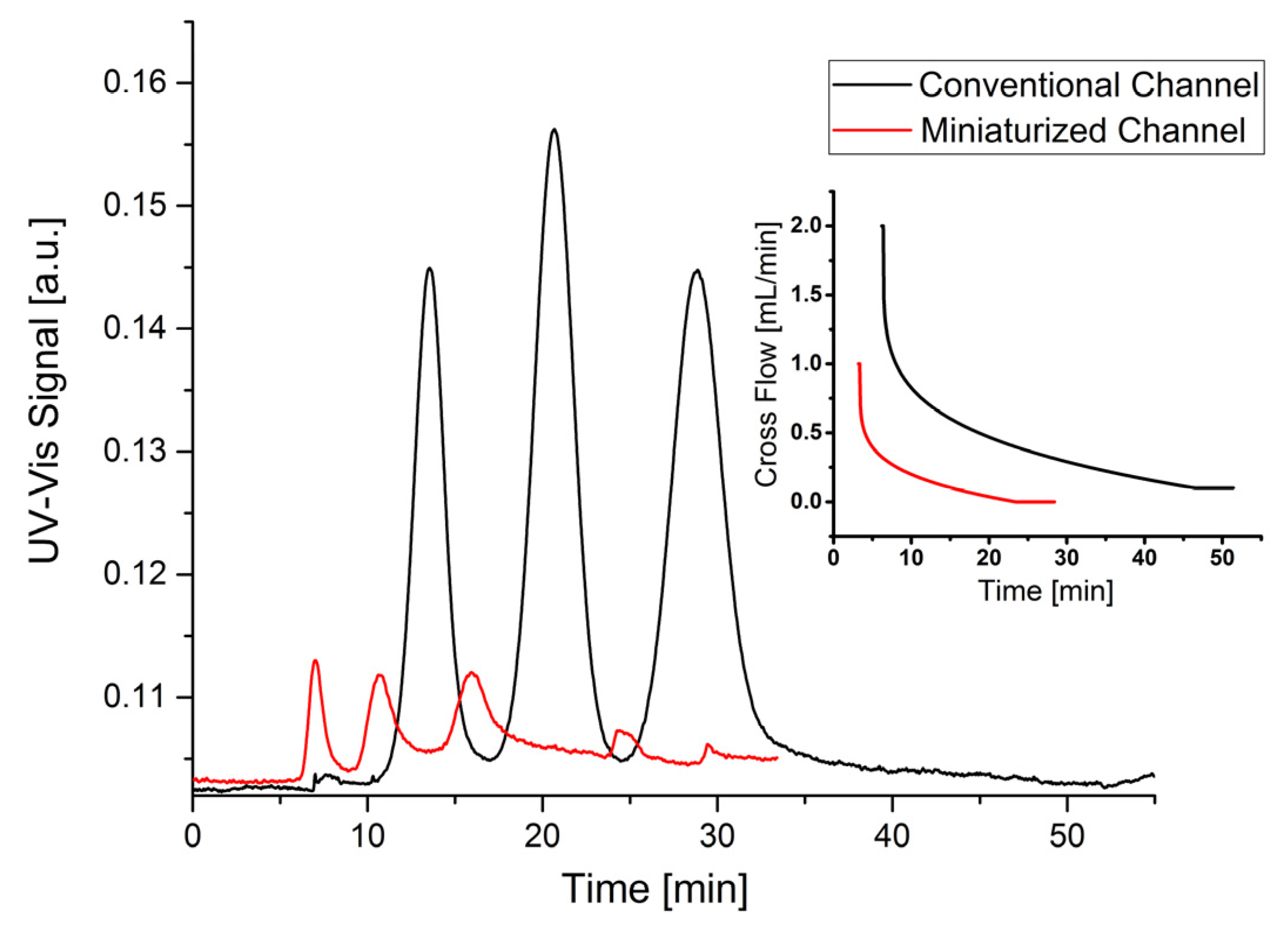 Table 7 that the peak resolution and the recovery rates of the miniaturized channel are lower than those of the conventional channel. A possible reason could be the comparatively high cross flow, which on the one hand improves the resolution, but on the other hand may induce agglomeration of particles. This assumption is supported by additional peaks at 25 min (see