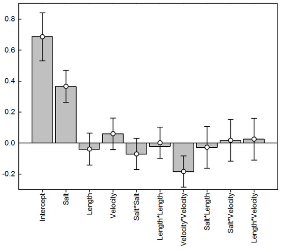 The coefficient plot resulting from the response surface regression of the screening experiments. The values on y-axis represents corresponding values of variables depicted on x-axis.