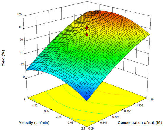 In this study, the best-fitting response surface provided a functional relationship between the objective function yield and the gradient explanatory factors salt concentration, length of gradient, and flow velocity. The normal probability plot of the residuals from the analysis was normally distributed, indicating no evidence of non-normality, skewedness, outliers, or the existence of unidentified variables. An R2 of 0.89 is probably due to the variations in the experiments at the six center points.