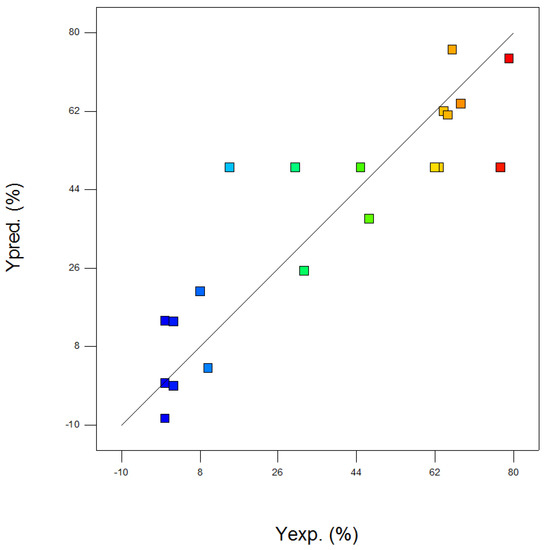 Based on this empiric model function and the modeling surfaces, the factor setups for maximum qualities of separation with respect to yield were predicted (see Table 2) and experiments to evaluate the results predicted by the model were performed. The comparison between experimental results and the empiric model predictions shows low predictability of the RSM model. As can be seen in Figure 4, the predicted coefficient of determination, pred-R2 of about 0.66, indicates a narrow predictability. In other words, quadratic RSM can only describe 66% of the variety in the experimental data.