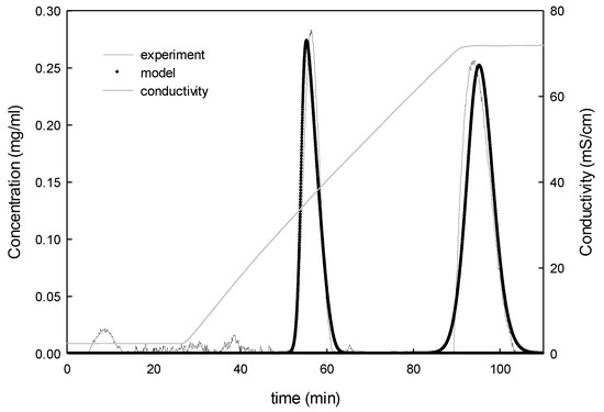 The successful predictions based on the calibrated and verified mechanistic model is a key associated to a model-integrated process development. The validation experiments were carried out as a gradient elution experiment with higher protein concentrations that were not used in the model calibration. The model fitted the validation experiment with relatively good accuracy; in Figure 5 an example chromatogram for the gradient elution experiments with 3.55 cm/min flow velocity, an elution gradient volume of 22.5 CV at 0.26, and 1.47 mg/mL for LP and LF concentrations is shown. The elution gradient was started after 50 min and continued for around 50 min, at which point 100% high-salt buffer with a salt concentration of 0.725 M NaCl was reached. The first breakthrough is LP and the second is LF. In the washing step, some of the LP and LF were washed out; the model did not capture this amount of protein loss, causing the lack of fit in the elution step at the chromatogram.
