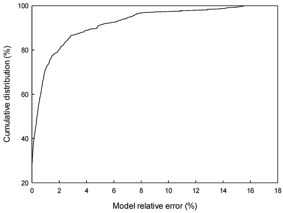 The cumulative distribution for the calibration and validation experiments plotted against the relative residual error.