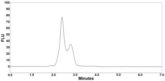 When compared with two validated HPLC/UV methods for posaconazole quantification in human serum or plasma samples [29,31], the current method provides a sensitive, cost-effective and time-saving procedure. Cendejas-Bueno et al. [29] used 150 µL of serum sample and 50 µL of injection volume to obtain an LOQ of 0.125 µg/mL (6.25 ng on column). Zhang et al. [31] reported a sensitive detection with an LLOQ of 0.05 µg/mL (1.5 ng on column) by using 100 µL of serum sample and 30 µL of injection volume. Based on their results, which showed that posaconazole’s retention time was ~6.95 min, the current method could be modified for the determination of posaconazole only with a gradient elution of 8 min or less. However, the modified procedure still requires an extra 5 min to allow the initial eluent to equilibrate the column after completing a gradient elution, which is unnecessary for the current method using isocratic elution. The current method took the advantage of sensitive fluorescence detection to achieve an LOQ of 0.1 µg/mL (1 ng on column) with a smaller injection volume (10 µL) and 100 µL of serum sample. Most important, an injection volume of 10 µL methanol extract allowed the HPLC system to load ~1500 injections without replacing pre-filter columns. According to our experience, the replacement of pre-filter columns was frequently needed after injecting 300–500 samples with an injection volume of 30 µL or 50 µL.
