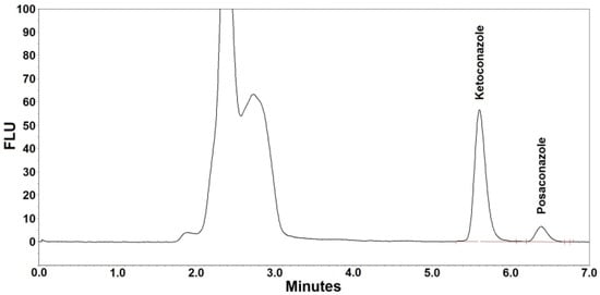 Representative chromatogram (ketoconazole at ~5.6 min, posaconazole at ~6.4 min) after extraction of a patient’s serum. The posaconazole concentration was 0.98 µg/mL.