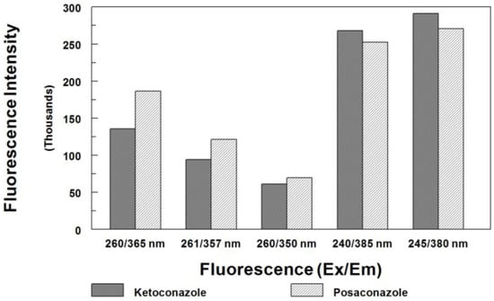 Prior to our current procedure, four HPLC/FL methods have been reported for measuring posaconazole in biological samples. The first method was developed by Muller et al. [32], in which the excitation and emission wavelengths were set at 260 and 365 nm, respectively. Their method required a long chromatography run (>23 min) to elute the IS (itraconazole). Sample preparation was tedious and labor-intensive. Although the method was sensitive, it needed 250 µL of plasma sample and 50 µL of injection volume to achieve an LOQ of 0.05 µg/mL (2.5 ng on column). Neubauer et al. [33] used different detector settings at 261 and 357 nm for the excitation and emission, respectively. Although the method needed only 50 µL serum, a complicate column-switching technique was used to isolate posaconazole from the serum matrix. This method required a total of 16 min to complete the chromatographic run per injection. Another method was reported by Buckner et al. [34], in which the excitation and emission wavelengths were set at 260 and 350 nm, respectively. Again, the method employed tedious sample preparation procedures consisted of liquid-liquid extraction, solvent evaporation and reconstitution prior to analysis. Although a chromatographic run could be completed in 8 min, the R051012 (used as internal standard) was not readily available. The most recent assay was reported by Hens et al. [35], in which the detection was at 385 nm with excitation at 240 nm, and a gradient run of 19 min was performed for the analysis. Again, their sample preparation was tedious and labor-intensive; sample volume was 1000 µL. In comparison, the current method used a simpler sample preparation, a smaller sample volume (100 µL), and a shorter chromatographic run time (<8 min). The optimized fluorescence detection was at 380 nm with excitation at 245 nm. Figure 3 shows the fluorescence intensities of posaconazole and ketoconazole at different settings. The current method offers the most sensitive detection.