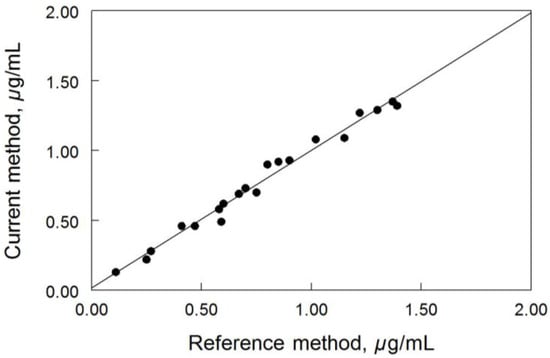 Cross-validation of the current method was examined by measuring the concentrations of posaconazole ranged from 0.1 to 1.4 µg/mL in 20 de-identified patient samples. The results obtained by this method were compared well with results from the reference method (Figure 4). The correlation between the two methods was good; the linear regression statistics indicated an r2 value of 0.982 (p < 0.0001). The linear regression equation for the correlation was y = 0.986x − 0.017 with a standard error value of 0.027; where y denotes the current method and x denotes the reference method.